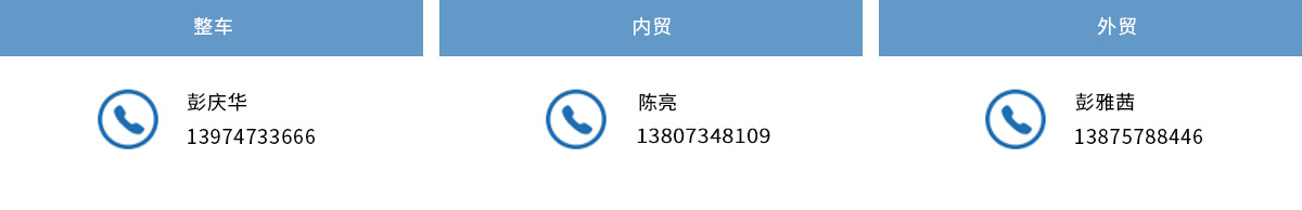 整車 聯系人:彭先生 電話:13974733666 內貿 聯系人:陳先生 電話:13807348109 外貿 聯系人:彭女士 電話:13875788446